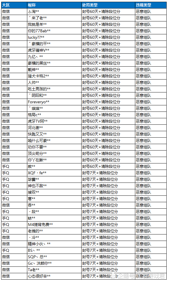 如上图所示,这数十位登上榜单的玩家获得了封号7天、封号60天以及统一“清除段位分”的惩罚。值得一提的是,如果各位小伙伴们仔细观察名单的话,还能发现熟悉的“主播ID”,多个ID里出现了“虎牙”哦~在天哥看来呢,虽然这些并不是封号10年,但是“清除段位”也意味着整个赛季都白打了,再加上封号7天到60天的惩罚,到时候早就SS7赛季了,就连SS6赛季获得的段位奖励都拿不到了。所以在这里也提醒各位小伙伴们,切莫在游戏中“恶意组队”哦!