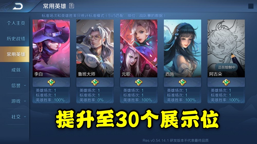 ÌåÑé·þÖÐÔÚ¸öÈËÖ÷Ò³ÀïµÄ³£ÓÃÓ¢ÐÛÕ½¼¨µÄչʾλ´Ó20¸öÌáÉýÖÁ30¸ö£¬Ò²¾ÍÊÇ˵ֻҪÔÚËùÓÐÈü¼¾ÖÐÍæ¹ý×î¶à³¡´ÎµÄ30ÃûÓ¢ÐÛ¶¼»áÔÚÀï±ß½øÐÐչʾ£¬¿ÉÒÔ¸ü¼Ó·½±ãµÄ²é¿´¸ü¶àÓ¢ÐÛÔÚÈü¼¾ÖеıíÏÖÒÔ¼°Ê¤ÂʵÄչʾ£¬¶ÔÕÒ¿¿Æ×µÄ¶ÓÓÑÒ²ÊÇÏ൱²»´íµÄ¡£