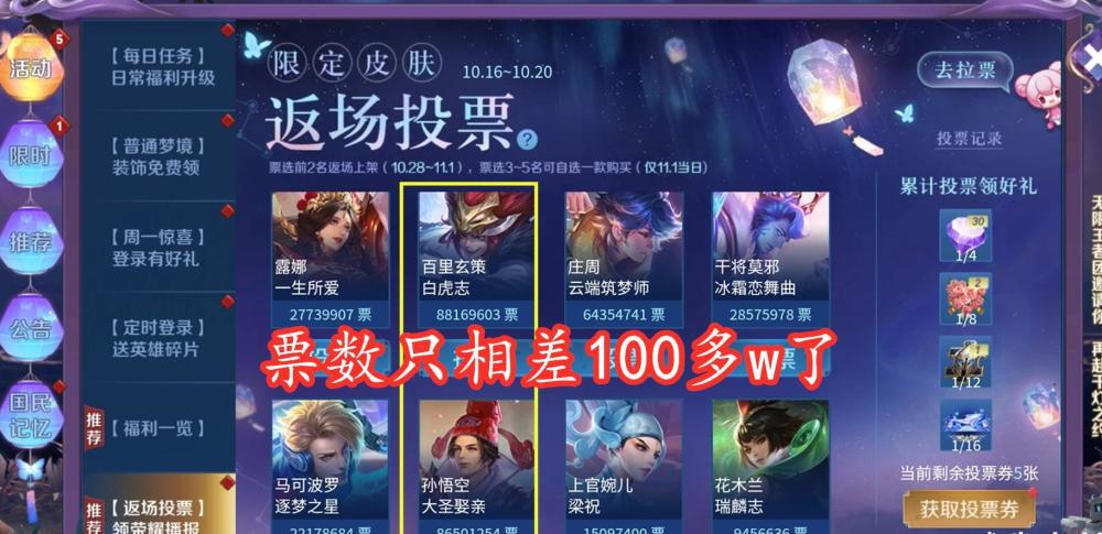 ¾àÀëÖÜÄêÇìÆ¤·ô·µ³¡µÄͶƱ£¬°´ÕÕ20ºÅ½áÊøÀ´ËãµÄ»°£¬Æäʵ»¹Ê£ÏÂ×îºóÒ»Ìì×óÓÒµÄʱ¼ä£¬¹ýÁË20ºÅ£¬Æ±ÊýÅÅÃûǰ5¾Í¶¨ÏÂÀ´ÁË¡£Æäʵ¾ÍËã²»µ½20ºÅ£¬°´ÕÕĿǰµÄͶƱ¾ÖÊÆÀ´¿´£¬Æ±ÊýµÄÅÅÃûǰ5Ò²ËãÊǶ¨ÏÂÀ´ÁË¡£Ö»ÊǵÚÒ»ºÍµÚ¶þÊÇËĿǰ»¹²»ºÃ˵£¬ÆäÓà»ù±¾È·¶¨ÍêÈ«¡£