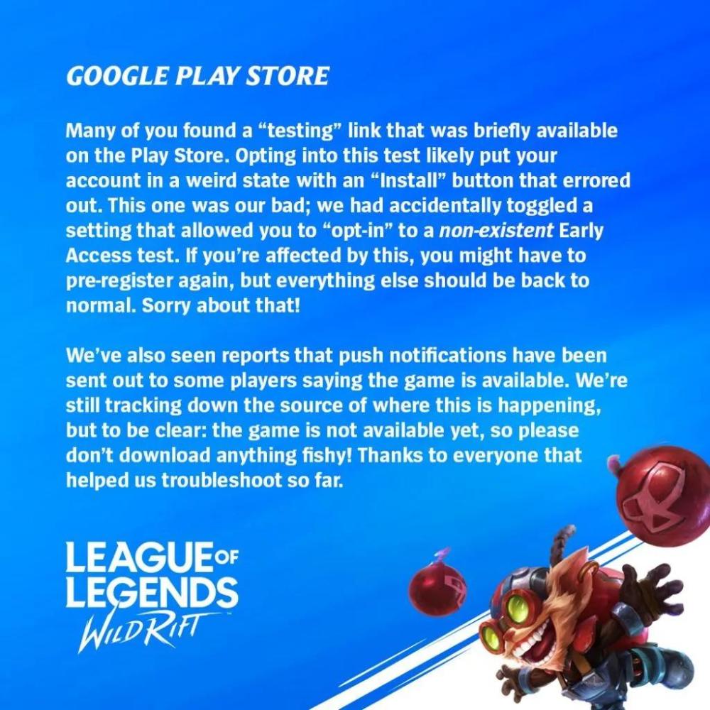 ¿ª·¢ÈËÔ±»¹Ì¸µ½ÁË×î½üÔÚGooglePlayÉ̵êÖз¢ÉúµÄ´íÎó£¬Ä³Ð©Íæ¼ÒÄܹ»ÔÚAndroidÉ̵êµÄÓÎÏ·Ò³ÃæÉÏ¿´µ½ÓÎÏ·°²×°°´Å¥¡£ÈÍ·±íʾÕâÊÇ¿ª·¢ÈËÔ±ÉèÖóöÁË´íÎó£¬Õâ¸ö°´Å¥²»Ð¡ÐÄÇл»ÁËÁíÒ»¸öÉèÖã¬ÔÊÐíÍæ¼ÒÑ¡Ôñ²»²Î¼ÓÔçÆÚµÄbeta²âÊÔ¡£Óöµ½´ËÎÊÌâµÄÍæ¼Ò¿ÉÄÜÒªÖØÐÂ×¢²áÒ»¸ö¹È¸èÕË»§¡£