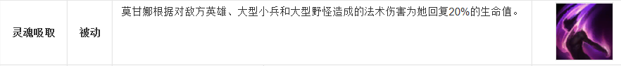±»¶¯£ºÁé»îÎüÈ¡¡£Äª¸ÊÄȶԵз½Ó¢ÐÛ¡¢´óÐÍС±øºÍ´óÐÍÒ°¹ÖÔì³ÉµÄħ·¨É˺¦£¬¿ÉÒÔת»¯Îª×ÔÉíµÄ20%µÄÉúÃüÖµ¡£ÀûÓÃQºÍW¼¼ÄܵÄÉ˺¦À´»Ø¸´ÉúÃüÖµ£¬ÔöÇ¿ÁËΏÊÄȵÄÐøº½ÄÜÁ¦¡£