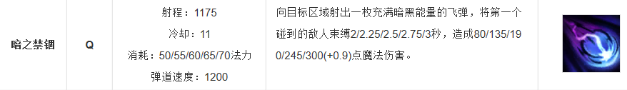 Q¼¼ÄÜ£º°µÖ®½ûïÀ¡£Äª¸ÊÄÈÏòǰ·½·¢Éä·Éµ¯£¬Åöµ½µÄµÚÒ»¸öµÐÈ˽«±»»áÊæ·þ2-3Ã룬²¢Ôì³Éħ·¨É˺¦¡£Äª¸ÊÄȵÄQ¼¼Äܲ»½ö¿ÉÒÔ×÷Ϊһ¸öÓÅÏȵÄÏÈÊÖ¼¼ÄÜ£¬¶øÇÒ»¹¿ÉÒÔ×÷Ϊһ¸ö²»´ÓµÄ·´ÊÖ¼¼ÄÜ£¬ÏÈÊֺͷ´ÊÖЧ¹û¼æ±¸µÃÒæÓÚΏÊÄÈQ¼¼ÄܵľàÀëÉèÖã¨ÏÈÊÖ¾àÀëÔ¶£¬·´ÊÖ¾àÀë¶Ì£©ºÍ¿ØÖÆÊ±¼ä³¤£¨2-3Ã룩¡£ÔÚ¡°Äª¸ÊÄȼÓŮ̹¡±×éºÏÖУ¬Äª¸ÊÄÈQ¼¼ÄÜͨ³£×÷Ϊ¿ØÖÆÁ´µÄ×îºóÒ»»·¡£