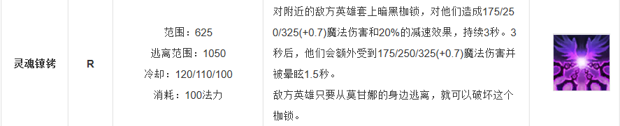 R¼¼ÄÜ£ºÁé»êÁÍîí¡£Äª¸ÊÄȶԸ½½üµÄµÐ·½Ó¢ÐÛÌ×ÉϼÏËø£¬²¢Ôì³ÉÉ˺¦ºÍ20%µÄ¼õËÙЧ¹û£¬³ÖÐø3Ãë¡£3Ãëºó£¬±»¼ÏËø¿ØÖÆ×¡µÄµÐ·½Ó¢ÐÛ»áÔÙ´ÎÊܵ½Ä§·¨É˺¦²¢±»¿ØÖÆ1.5Ã롣ΏÊÄȵÄR¼¼ÄÜÐèÒª½üÉí²ÅÄÜ´ò³ö¿ØÖÆÐ§¹û£¬¿ÉÒÔ×÷ΪŮ̹EQR+ΏÊÄÈQ×ܹ²5.25£¨0.5+1.25+1.5+2£©ÃëÖ®ºóµÄ±£ÏÕÊֶΣ¬¼ÈÓÐħ·¨É˺¦ÓÖÓÐ1.5Ãë¿ØÖÆÐ§¹û£¬È·±£±ØÉ±µÐ·½Ò»ÃûÓ¢ÐÛ¡£