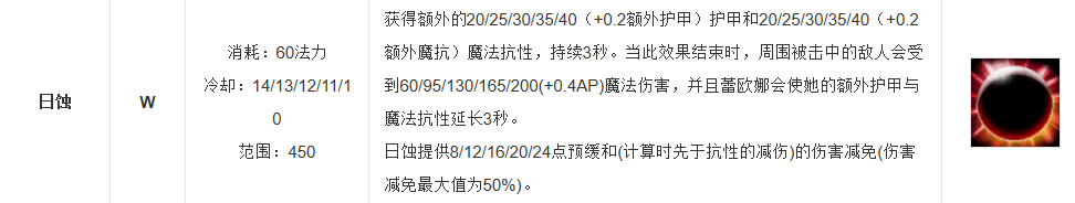 W¼¼ÄÜ£ºÈÕÊ´¡£Å®Ì¹Ê¹ÓÃW¼¼ÄÜÄܰïÖú×Ô¼º»ñµÃ¶îÍâµÄ»¤¼×ºÍħ·¨¿¹ÐÔ£¬³ÖÐø3Ãë¡£µ±¡°ÈÕÊ´¡±Ð§¹û½áÊøºó£¬»á±»ÖÜΧµÄµÐ·½Ó¢ÐÛÔì³É·¶Î§µÄħ·¨É˺¦£¬Èç¹ûÓез½Ó¢ÐÛ±»»÷ÖУ¬ÔòŮ̹»á½«¡°ÈÕÊ´¡±¼ÓË«¿¹µÄЧ¹ûÑÓ³¤3Ã룬´ËÍ⻹¼õÉË¡£Å®Ì¹W¼¼ÄÜÊÇ·ÀÓù¼¼ÄÜ£¬Ôö¼ÓµÄ»¤¼×ºÍħ·¨¿¹ÐÔ¶¼Ê®·Ö¿É¹Û£¬×î¶à¿ÉÑÓÐøµ½6ÃëÖ®¾Ã£¬Õâ¸ö6Ãë¶ÔÓÚ¡°Äª¸ÊÄȼÓŮ̹×éºÏ¡±À´Ëµ³¬¹ýÁËÁ½ÈËÅäºÏµÄ¿ØÖÆÁ´£¨Å®Ì¹EQR=3.25Ã룬ΏÊÄÈQ¼¼ÄÜ2Ã룩×Üʱ³¤¡£ÓÐ×ÅW¼¼ÄÜÔö¼ÓË«¿¹ÇÒ¼õÉ˵ÄŮ̹£¬²»ÈÝÒ×±»µÐ·½Ëù»÷ɱ¡£
