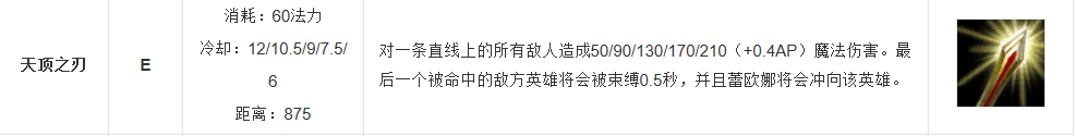 E¼¼ÄÜ£ºÌì¶¥Ö®ÈС£Å®Ì¹Ê¹ÓÃE¼¼Äܺ󣬶ÔÒ»ÌõÖ±ÏßÉϵÄËùÓеÐÈËÔì³Éħ·¨É˺¦¡£×îºóÒ»¸ö±»ÃüÖеĵз½Ó¢Ðۻᱻ¿ØÖÆ0.5Ã룬ÇÒŮ̹»á³åÏòÕâ¸ö±»¿ØÖƵÄÓ¢ÐÛ¡£Å®Ì¹µÄE¼¼ÄܽÏÖ®ÓÚQ¼¼ÄÜ£¬¾ßÓиüÔ¶µÄ¿ØÖƾàÀ룬ËùÒÔŮ̹µÄE¼¼Äܳ£³£×÷ΪÏÈÊÖ¿ØÖƼ¼ÄÜ¡£Èç¹ûŮ̹ʹÓÃE¼¼ÄÜÃüÖез½Ó¢ÐÛ£¬¿ÉÒÔÔÙ½ÓQ¼¼ÄÜÀ´´ò³öÒ»¸öEQ¶þÁ¬¿ØÖÆÁ¬ÕС£