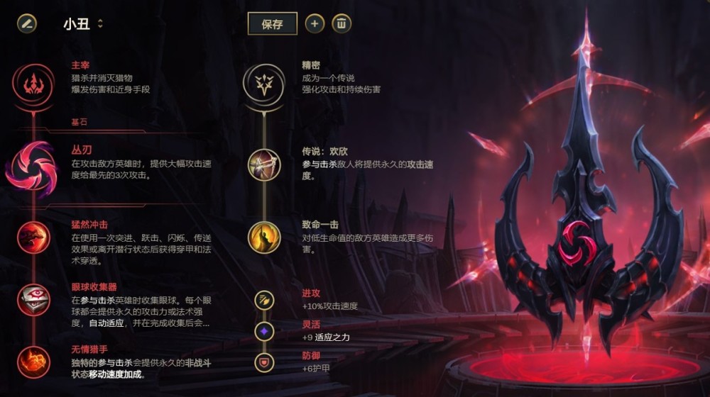 最适合小丑的基石符文是丛刃,利用丛刃打连续背刺可以在短时间内打出更高的爆发,配合猛然冲击的双穿效果极佳,另外两个符文则点出眼球收集器与无情猎手。