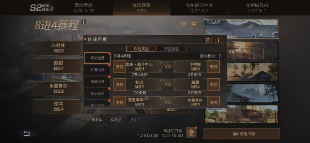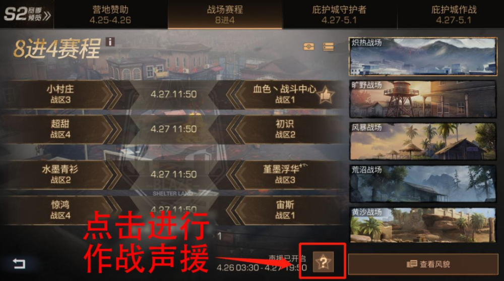 ×÷Õ½ÉùÔ®£ºÔÚ±ÈÈüǰһÌì3:30ÖÁ±ÈÈüµ±Ìì19:50£¬ËùÓÐÐÒ´æÕ߿ɶԲÎÈüÓªµØ½øÐÐÉùÔ®³õÈü¡¢°ë¾öÈü¡¢¾öÈüÆÚ¼ä£¬ÐÒ´æÕßÔÚÿ¸öÕ½³¡Ö»ÄÜÖ§³ÖÒ»¸öÓªµØ¡£
