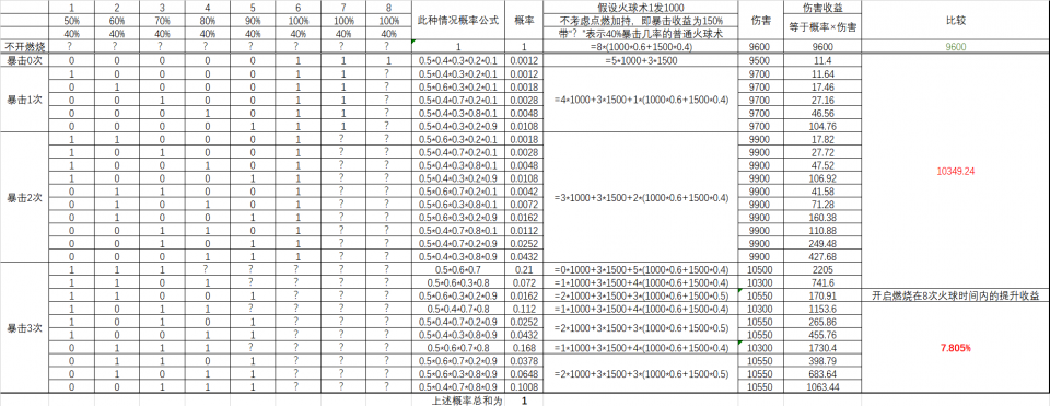 1¡¢ÔÚÒÔÉÏǰÌáÏ£¬¡°È¼ÉÕ¡±¿ªÆôÒ»´ÎÔÚ8´Î»ðÇòÊõµÄʱ¼äÄÚÉ˺¦ÆÚÍûÌáÉý7.8%£¬8´Î»ðÇòÔÚÆ½ÉäÏÂÊÇ24s£¬ÔÚ˼ά¼ÓËÙÆÚ¼äÊÇ 2.3*8=18.4s µÄʱ¼ä¡£Òò´Ë¿ÉÒÔÀí½âÔÚʹÓÃÁË˼ά¼ÓËٺ󣬼ÙÉèÕ½¶·Ê±³¤Îª1·ÖÖÓ£¬¡°È¼ÉÕ¡±ÄÜʹµÃ»ð·¨Êä³öÌáÉý 7.8%*(18.4)/60 = 2.392% ¡£
