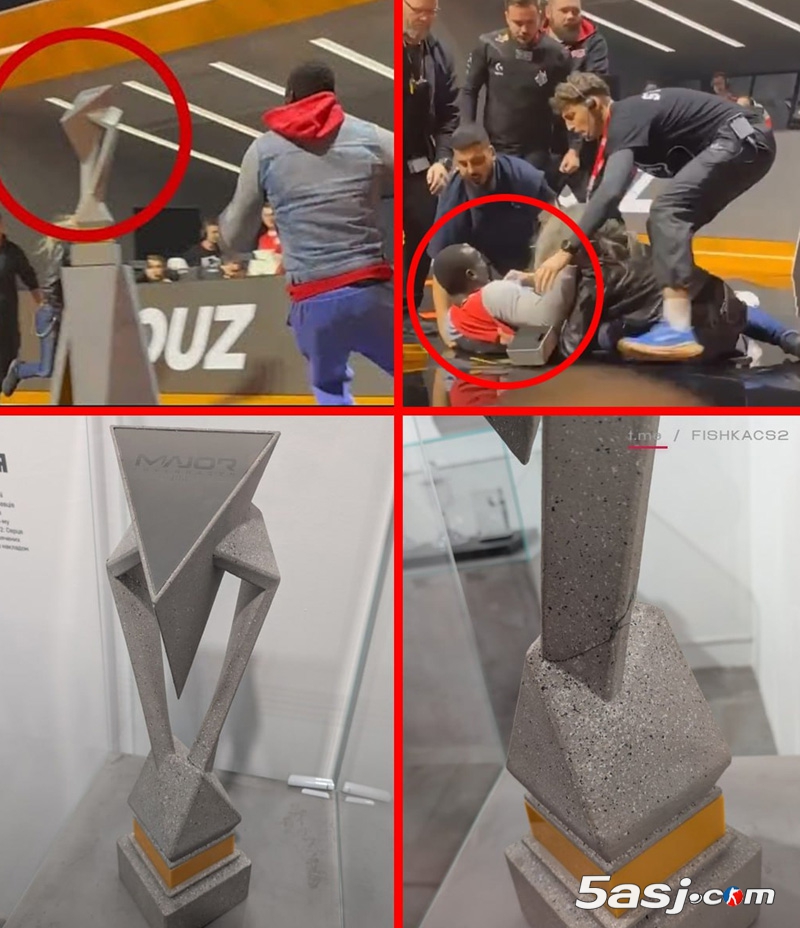 在2024年的PGL 哥本哈根Major四分之一决赛G2对阵MOUZ的比赛中,一场抗议活动,演变成了一场舞台骚乱。在抗议者冲上舞台后,安保人员与闹事者发生了激烈的肢体冲突。混乱中,一名抗议者重重地摔在了奖杯之上,将其当场砸成了两段,这一幕也成为那届Major最不光彩的印记。