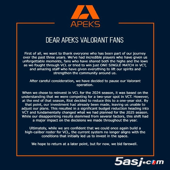 前临时席位队伍Apeks宣布暂停无畏契约项目的运营,原文大致翻译如下: