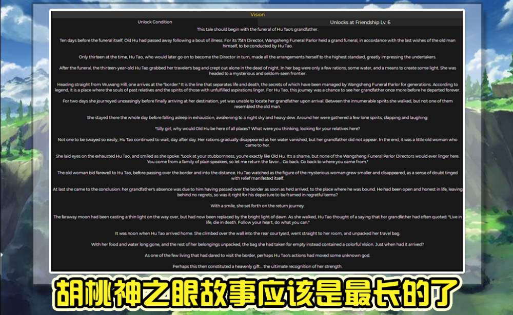 ±¾´ÎÄÚ¹í½â°ü³öÀ´µÄ»¹ÓÐÐÂÎåÐǽÇÉ«ºúÌҵĺøжȹÊÊ£¬ËäÈ»²¢²»ÊǺÜÍêÕû£¬Ö»ÓнÇÉ«¹ÊÊÂÒ»¡¢¶þºÍÉñÖ®Ñ۵ĹÊÊ£¬µ«ÊǺúÌÒÉñÖ®Ñ۵ĹÊʼòֱ̫ÇúÕÛÁË£¬´ó¼Ò¿ÉÒÔ¿´¿´ÉÏͼ£¬Ó¦¸ÃÊÇĿǰΪֹÉñÖ®ÑÛ¹ÊÊÂ×µÄ½ÇÉ«¡£ÎÒÃǼòÒª¸ø´ó¼Ò·Òëһϣ¬ºúÌÒÊÇÍùÉúÌõÚ77´úÌÃÖ÷£¬ËýµÄÒ¯Ò¯ÊÇ75´úÌÃÖ÷£¬ËýүүȥÊÀºó£¬Äê½ö13ËêµÄºúÌÒΪËûÒ¯Ò¯²Ù°ìÁËÔáÀñ¡£ÔáÀñ½áÊøµÄµ±Ì죬ºúÌҾʹø×żòµ¥µÄÐÐÀî´ÓÎÞÍýÆÂ³ö·¢£¬Ç°ÍùÓëÄǸöÊÀ½çµÄ½çÏÞ£¬ºúÌÒÏëÔÚÄÇÀï¼û×Ô¼ºÒ¯Ò¯×îºóÒ»Ãæ£¬µÈÁ˺ü¸Ì춼ûÓöµ½£¬¸ÉÁ¸Öð½¥³ÔÍ꣬µ«ºúÌÒ»¹ÔÚ¼á³Ö£¬ÆÚ¼äÓöµ½ÁËÐí¶àÆäËûÈÏʶËýµÄÁé»ê£¬µ«¾ÍÊǵȲ»µ½Ò¯Ò¯£¬×îºóһλÀÏÄÌÄÌȰËý»Ø¼Ò£¬ºúÌÒÒ²¾õµÃ¼û²»µ½Ò¯Ò¯£¬ÊÇÒòΪүүûÓÐÍ£Áô£¬Ò»ÉúûÓÐÒź¶£¬Ö±½ÓÈ¥Á˱˰¶£¬Ò¯Ò¯³£ËµµÄÒ»¾ä»°¾ÍÊÇ£º×·Ñ°±¾ÐÄ£¬¾¡¼ºËùÄÜ¡£ÓÚÊǺúÌÒÃæ´øÎ¢Ð¦£¬Ì¤ÉϹé;£¬ºúÌһؼҺó´ò¿ªÐÐÄÒ£¬Ë®ºÍ¸ÉÁ¸Ôç¾Í³ÔÍêÁË£¬µ«ÊÇһöҫÑÛµÄÉñÖ®ÑÛ³öÏÖÁË¡£