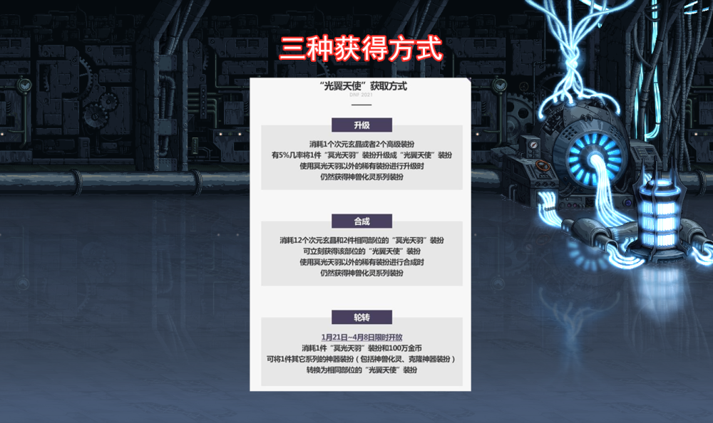 Õâ´ÎϲÌáÉý¼¶µÄÊǹú·þÍÆ³öµÄµÚËÄÌ×Ìì¿Õ¡°Ú¤¹âÌìÓðÌס±£¬¸ù¾Ý·Å³öµÄÏûÏ¢À´¿´£¬Éý¼¶ºÏ³É·½Ê½ºÍµÚÒ»¿îÉñÆ÷×°°çÒ»Ñù£¬Ö»²»¹ýºÏ³ÉºÍÉý¼¶ËùÐèÒªµÄÌì¿Õ±ØÐëÊÇÌìËIJſÉÒÔ£¬ÌìËÄÉý¼¶ºóµÄÉñÆ÷×°°ç½Ð¡°¹âÒíÌìʹ¡±£¬Èç¹ûÓõÄÊDZðµÄÌì¿ÕÌ׺ϳɻòÉý¼¶³É¹¦ºóµÃµ½µÄÒÀ¾ÉÊǵÚÒ»Ì×ÁúÅÛ¡°ÉñÊÞ»¯ÁéÌס±¡£