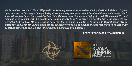 ¡¡¡¡×òÌ죬PPDÔÚÍÆÌØÉÏÐû²¼ËûÃǶÓÎéµÄ3ºÅλѡÊÖ33ÒòΪÒÔÉ«Áйú¼®ÎÊÌâÎÞ·¨»ñµÃÂíÀ´Î÷ÑÇǩ֤£¬ËùÒÔ½«ÑûÇëLiquidÕ½¶ÓµÄMC×÷ÎªÌæ²¹²ÎÈü¡£Óë´Ëͬʱ£¬PPD»¹±íʾս¶Ó²»Ó¦ÒòΪÕâÖÖÎÊÌâ¶ø±»¿Ûµô40%µÄDPC»ý·Ö£¬Ï£ÍûVÉçÔÚ¿´µ½ÕâÌõÍÆÌØºóÄܹ»»Ø¸´ËûÃǵÄÓʼþ¡£