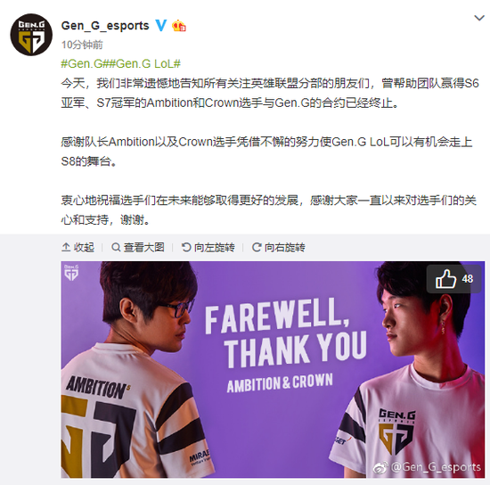 ¡¡¡¡½ñÌ죬ÎÒÃǷdz£Òź¶µØ¸æÖªËùÓйØ×¢Ó¢ÐÛÁªÃË·Ö²¿µÄÅóÓÑÃÇ£¬Ôø°ïÖúÍŶÓÓ®µÃS6ÑǾü¡¢S7¹Ú¾üµÄAmbitionºÍCrownÑ¡ÊÖÓëGen.GµÄºÏÔ¼ÒѾÖÕÖ¹¡£