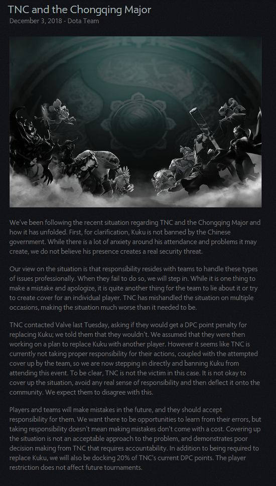 ¡¡¡¡TNCÔÚÖܶþѯÎÊVÉçÈç¹ûËûÃÇÕÒÈËÌæ»»KukuÊDz»ÊDz»»áÓÐDPC·ÖÊý³Í·££¬VÉç±íʾ²»»á¡£Ö®ºóVÉç¾ÍÈÏΪTNCÊÇ¿ªÊ¼¼Æ»®ÕÒÈË´úÌæKuku¡£µ«ÊÇÖ®ºóVÉç·¢ÏÖTNC²¢Ã»ÓÐ×ö³öÕýÈ·µÄÐÐΪ£¬¶øÊÇÏëÒª¼ÌÐøÕÒ·½·¨ÍÑÔ𣬼øÓÚÕâ¸öÇé¿ö£¬VÉçÈÏΪÐèÒª³öÃæ½ûÖ¹Kuku²Î¼ÓÖØÇìMajor¡£VÉçÈÏΪÕâ´ÎʼþTNC²»ÊÇÊܺ¦Õߣ¬ËûÃDz»Ó¦¸ÃÑÚ¸ÇÊÂʵ²¢ÇÒûÓÐÕæµÄ¸ºÆðÓ¦¸ÃÓеÄÔðÈÎͬʱɿ¶¯ÉçÇø¡£