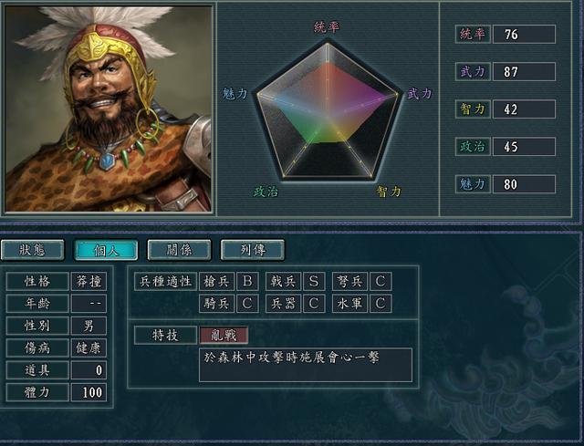 ͬÑù¾ßÓÐÕâ¸öÌØ¼¼µÄÎ佫»¹ÓÐÃÏ»ñºÍÀä°ú£¬µ«Ö»ÓÐÁõ±ÙÓµÓÐÁËÉÉñÕâÑùµÄ³ÆºÅ¡£ÕâÊÇÒòΪÁõ±ÙËäÈ»¸÷·½ÃæÊýÖµÉÏ´ó¶à¶¼²»ÈçÆäËû¶þÈË¡£µ«Áõ±ÙµÄǹ±øÊÇÊÊÐÔÊÇA£¬ËùÒÔÃÏ»ñºÍÀä°úÔòÊÇBºÍCµÄÊÂÇé¡£