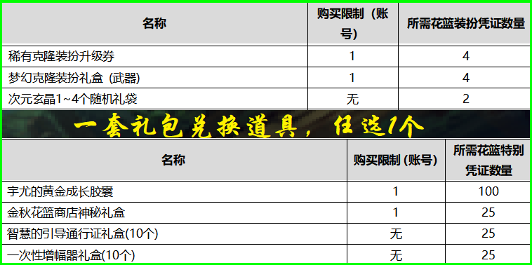 10¸ö×°°ç»¨Àº¿É¶Ò»»ÎäÆ÷͸Ã÷×°°ç+͸Ã÷Ìì¿ÕÉý¼¶È¯£¬Õâ϶þÕß¶¼ÓÐÁË£¬¶øÇÒ»¹Ê£2¸ö»¨Àº£¬¿ÉÒÔÖ±½Ó»»ÎäÆ÷×°°çÌ××°£¨º¬²ÓÀûÕÕ£©£¬»òÕß´ÎÔª½á¾§Àñ´ü£»»òÕßÖ±½Ó¶Ò»»2¸öÎäÆ÷͸Ã÷×°°ç£¬