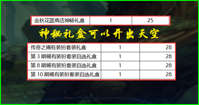ÁíÍâ²¹³äÒ»µã£¬ÔÚ¡°½ðÇﻨÀº¡±ÖеÄÉñÃØÀñºÐ£¬Ö»ÐèÒª25¸öÓ²±Ò¾Í¿ÉÒÔ¹ºÂò£¬ÀíÂÛÉÏÊÇ¿ÉÒÔ¿ª³ö×·ÒäÌì¿ÕÌ׵ģ¬ËùÒÔ¼´±ãÂò²»Æð6Ì×Àñ°ü£¬Âò¸öÉñÃØÀñºÐ£¬Ò²ÊÇ¿ÉÒÔÆðµ½Í¬Ñù×÷Óõ썷è¿ñ°µÊ¾£©¡£