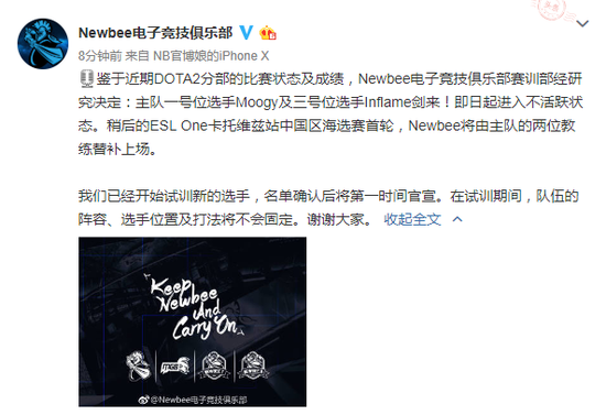 ¼øÓÚ½üÆÚdota2·Ö²¿µÄ±ÈÈü״̬¼°³É¼¨£¬Newbeeµç×Ó¾º¼¼¾ãÀÖ²¿Èüѵ²¿¾Ñо¿¾ö¶¨£ºÖ÷¶ÓÒ»ºÅλѡÊÖMoogy¼°ÈýºÅλѡÊÖInflame½£À´!¼´ÈÕÆð½øÈë²»»îԾ״̬¡£ÉÔºóµÄESL One¿¨ÍÐά×ÈÕ¾ÖйúÇøº£Ñ¡ÈüÊ×ÂÖ£¬Newbee½«ÓÉÖ÷¶ÓµÄÁ½Î»½ÌÁ·Ìæ²¹Éϳ¡¡£