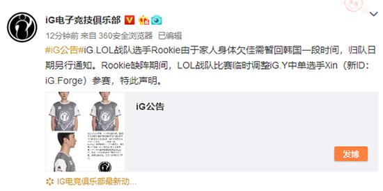 ¡¡¡¡iG.LOLÕ½¶ÓÑ¡ÊÖRookieÓÉÓÚ¼ÒÈËÉíÌåÇ·¼ÑÐèÔݻغ«¹úÒ»¶Îʱ¼ä£¬¹é¶ÓÈÕÆÚÁíÐÐ֪ͨ¡£RookieȱÕóÆÚ¼ä£¬LOLÕ½¶Ó±ÈÈüÁÙʱµ÷ÕûiG.YÖе¥Ñ¡ÊÖXin£¨ÐÂID£ºiG.Forge£©²ÎÈü£¬ÌØ´ËÉùÃ÷¡£
