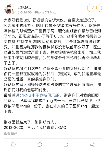 RNG·½ÃæÒ²ÔÚUziÐû²¼ÍËÒÛºó·¢±íÁËÐµĶ¯Ì¬£º¡°ÎÞÂÛºÎʱ£¬Äã¶¼ÊÇÎÒÃÇÐÄÖÐÓÀÔ¶µÄ×ÔºÀ¡£¡±
