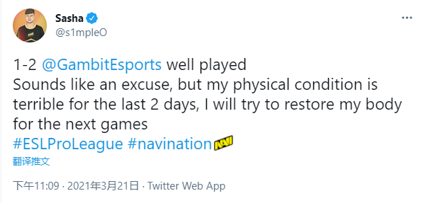 Èüºó£¬s1mpleÔÚ×Ô¼ºµÄÉ罻ƽ̨Éϱí´ïÁË×Ô¼ºµÄǸÒ⣺¡°1-2Ê䏸ÁËGambit£¬ËûÃÇȷʵ±íÏÖ³öÉ«¡£¾¡¹ÜÌýÆðÀ´ÏñÊǽè¿Ú£¬µ«²»µÃ²»³ÐÈÏ£¬ÎÒ×î½üµÄÉíÌå×´¿öºÜÔã¸â£¬ÎÒ»áÕùÈ¡ÔÚÏÂÒ»³¡±ÈÈüǰ»Ö¸´¡£¡±
