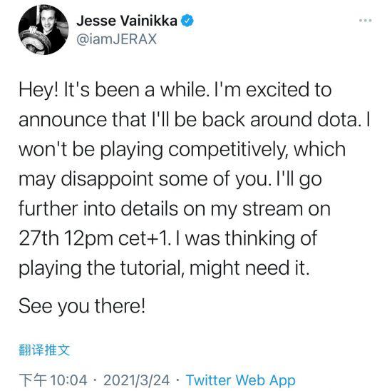 Á½½ìTI¹Ú¾üµÃÖ÷JerAxÔÚÉ罻ƽ̨Ðû²¼½«ÖØ·µdota2£¬µ«Í¬Ê±ÕâλǰְҵѡÊÖÒ²Ã÷È·±íʾ²»»á²Î¼ÓÖ°Òµ±ÈÈü¡£