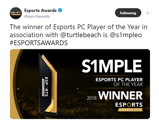 ¡¡¡¡ÔÚ¸Õ¸ÕÂäÏÂá¡Ä»µÄeSports Awards µç×Ó¾º¼¼²úÒµ½±°ä½±µäÀñÉÏ£¬¶àÏîÓÉ·Û˿ͶƱÆÀÑ¡³öÀ´µÄ´ó½±¹«²¼£¬s1mpleÈÙâßÄê¶È×î¼ÑPCÑ¡ÊÖ¡£