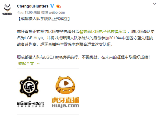 »¢ÑÀÖ±²¥ÕýʽǩԼLGEÊØÍûÏÈ·æ·Ö²¿@ÁظÐLGEµç×Ó¾º¼¼¾ãÀÖ²¿ £¬ÔLGEÕ½¶Ó¸üÃûΪLGE.Huya£¬²¢½«ÒԳɶ¼ÁÔÈ˶ÓѧԺ¶ÓµÄÉí·Ý²Î¼Ó2019ÄêÖйúÇøÊØÍûÏÈ·æÌôÕ½ÕßϵÁÐÈü£¬»¢ÑÀÖ±²¥½«ÓëÁظе羺ÁªºÏÔËÓªÕâÖ§¶ÓÎé¡£