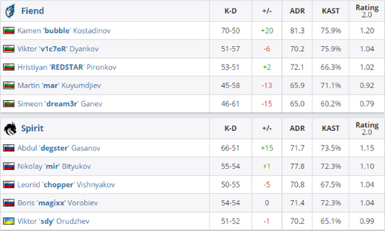 FiendÔÚ×ÔѡͼMirageÉϳä·ÖÕ¹ÏÖ³ö¶ÓÎéʵÁ¦£¬½ø¹¥ºÍ·ÀÊØ¶¼ÓÐ×Ô¼ºµÄ·ç¸ñ£¬ÓÈÆäÊÇbubbleÒ»ÈËÔÚδ¼ÓʱµÄÇé¿öϾÍÈ¡µÃ31-10µÄK-D£¬Í¼Ò»×îºórating´ïµ½¿Ö²ÀµÄ2.01£¬16-9ÄÃÏÂÊ×ͼµÄFiend¸ø×ãÁËSpiritѹÁ¦¡£Í¼¶þOverpass£¬Éϰ볡SpiritÉîÏÝÁÓÊÆ£¬½ø¹¥´ò²»¿ª¾ÖÃæ£¬´¦´¦Êܵ½Ç£ÖÆ£¬ËùÐÒϰ볡degsterµÄ·ÀÊØ´ó¾Ñ·¢»Ó¾Þ´ó×÷Óã¬Spiritµ÷Õû״̬ÔÚ¼Óʱºó19-17Ó®ÏÂͼ¶þ¡£Í¼ÈýNuke¾ÍÊÇÒ»±ßµ¹µÄ£¬Spirit¿ÉÒÔ˵Êǽ¥Èë¼Ñ¾³£¬±¬µ¯ÌáËٳɹ¦Âʼ«¸ß£¬chopper¡¢mirµÈ²½Ç¹ÊÖ¶¼´ò³öÁË¡°³É¶Ö¡±µÄÉ˺¦£¬FiendÍêȫûÓз´¿¹µÄÓàµØ6-16ͼÈý¸æ¸º¡£