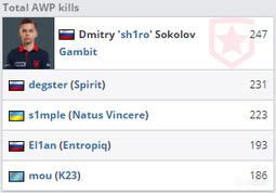 sh1roÎȶ¨µÄ¾Ñ»÷·¢»Ó£¬Ò»Ö±ÊÇGambitÈ¡µÃʤÀûµÄÖØÒªÒòËØ¡£Æ¾½èÈüÊÂ×î¶àµÄAWP»÷ɱÊýºÍ×î¸ßµÄÊ×ɱ³É¹¦ÂÊ£¬sh1ro³ÉΪ±¾½ìÈüʵľѻ÷¾«Ó¢¡£