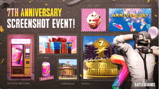 ΪÁË»¶ÇìPUBG 7ÖÜÄêµÄµ½À´£¬¡¶PUBG¡·½«¾Ù°ìÒ»³¡»ªÀöµÄÇìµä»î¶¯¡£Ê×ÏÈ£¬°¬Â׸ñµÄѧУºÍ×ÔÖú²ÍÌüÒѱäÉí³ÉΪ³äÂú»îÁ¦µÄÆßÖÜÄêÖ÷ÌⳡËù¡£×ÔÖú²ÍÌüµÄ×Ô¶¯ÊÛ»õ»úÌṩ7%µÄ»ú»á·¢·ÅÆß±ÄÜÁ¿ÒûÁϽ±Àø£¬ËùÓÐÒûÁ϶¼Éí×ÅÖÜÄê¼ÍÄîÊ¢×°¡£ËùÓеØÍ¼µÄ³öÉúµã´¦Îª´ó¼Ò×¼±¸Á˿ɹ©Í¶ÖÀµÄ7ÖÜÄêÖ½±µ°¸âºÍ¾ªÏ²ÀñÆ·Ïä¡£´ËÍ⣬¸÷µØÍ¼ÉÏµÄ¹ã¸æÅÆ¡¢×°ÊÎÆ·¡¢¿ÕͶ²¹¸øÏäºÍ·É»úºá·ù¶¼ÒÔÆßÖÜÄêΪÖ÷Ìâ½øÐÐÁË×°ÊΡ£